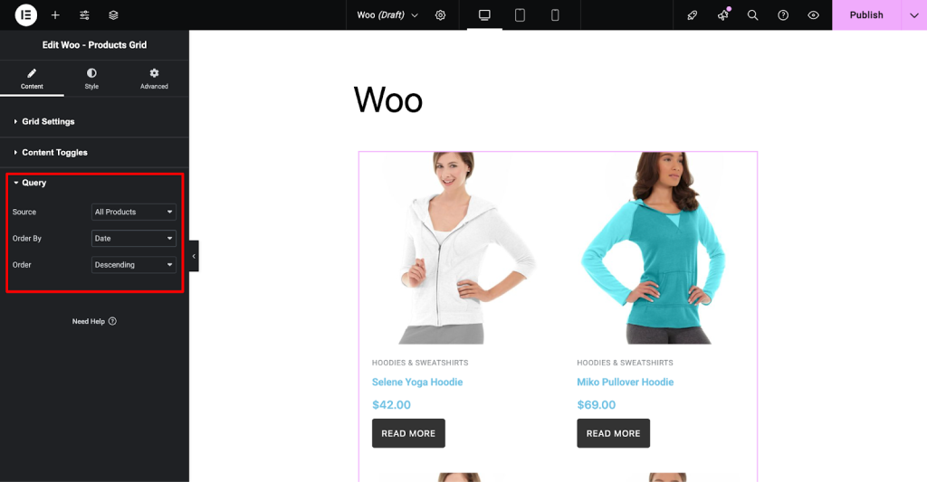 The Woo Product Grid widget lets you showcase your WooCommerce products in a customizable grid layout. From basic shop pages to advanced product showcases, this widget gives you full control over what details to display, how to style them, and how products should be queried.
