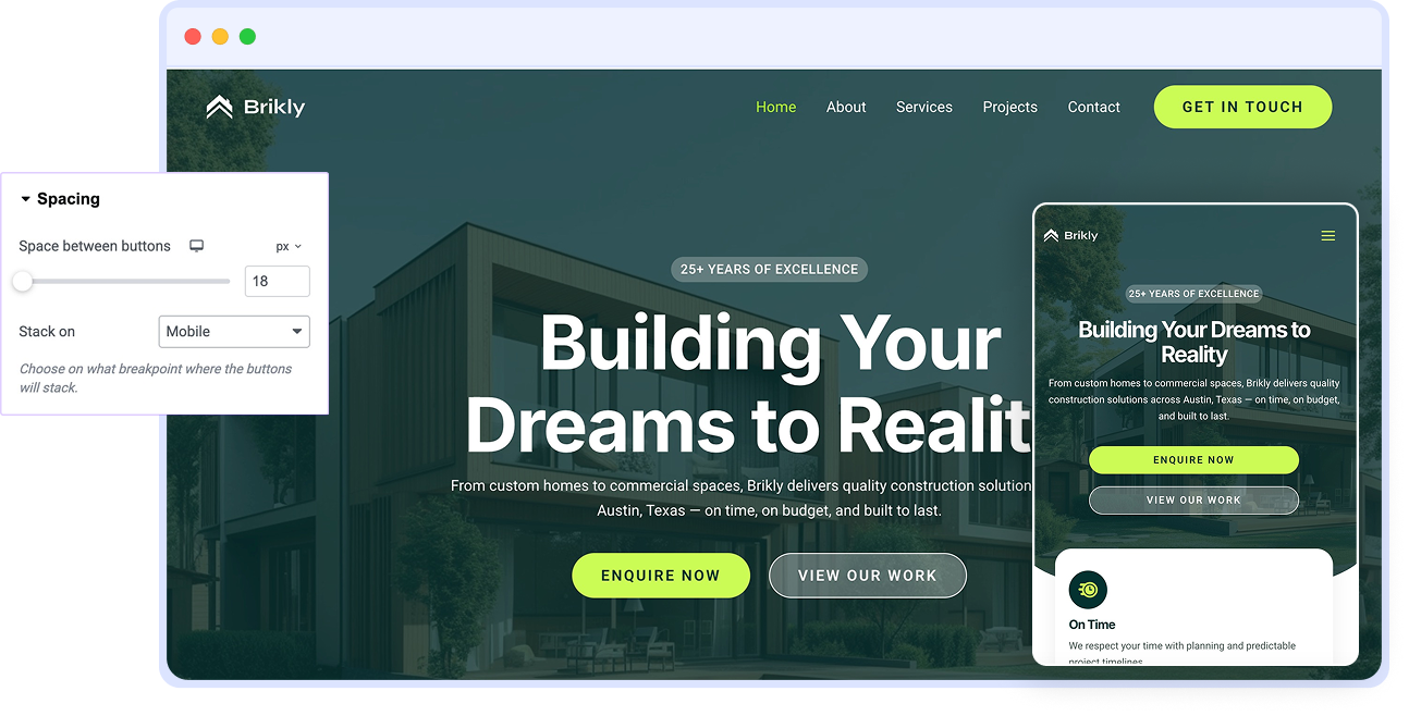 Tailor every element of your dual-button layout from shape to spacing, alignment to responsiveness.