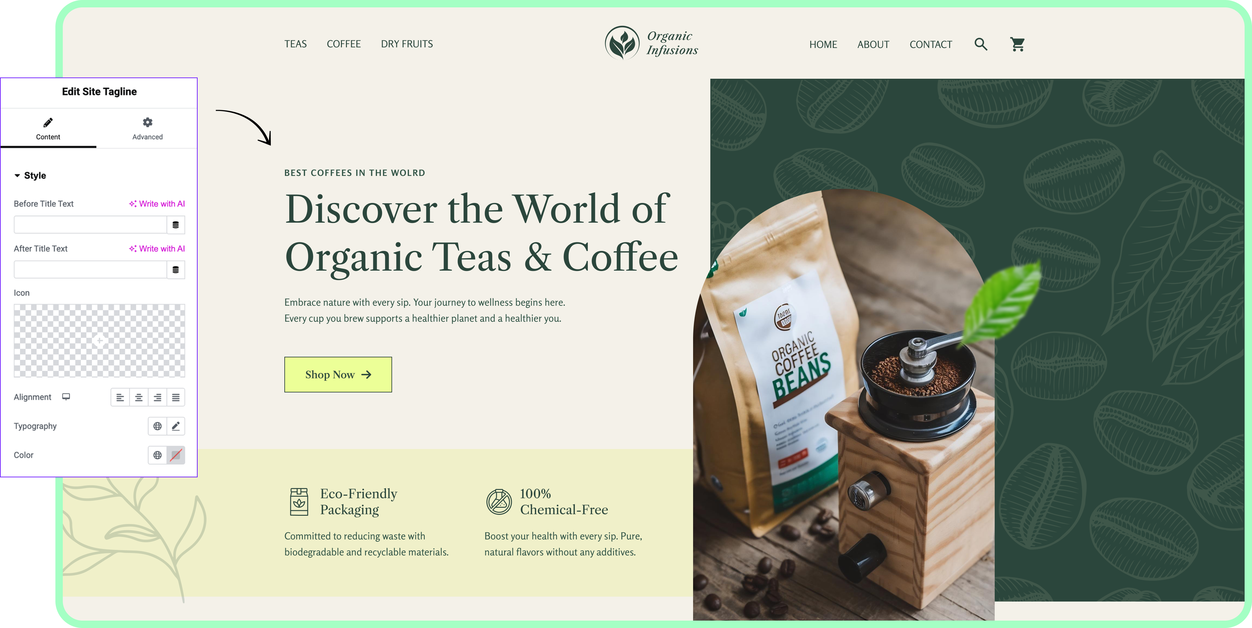 Control every part of your site tagline’s design inside Elementor.