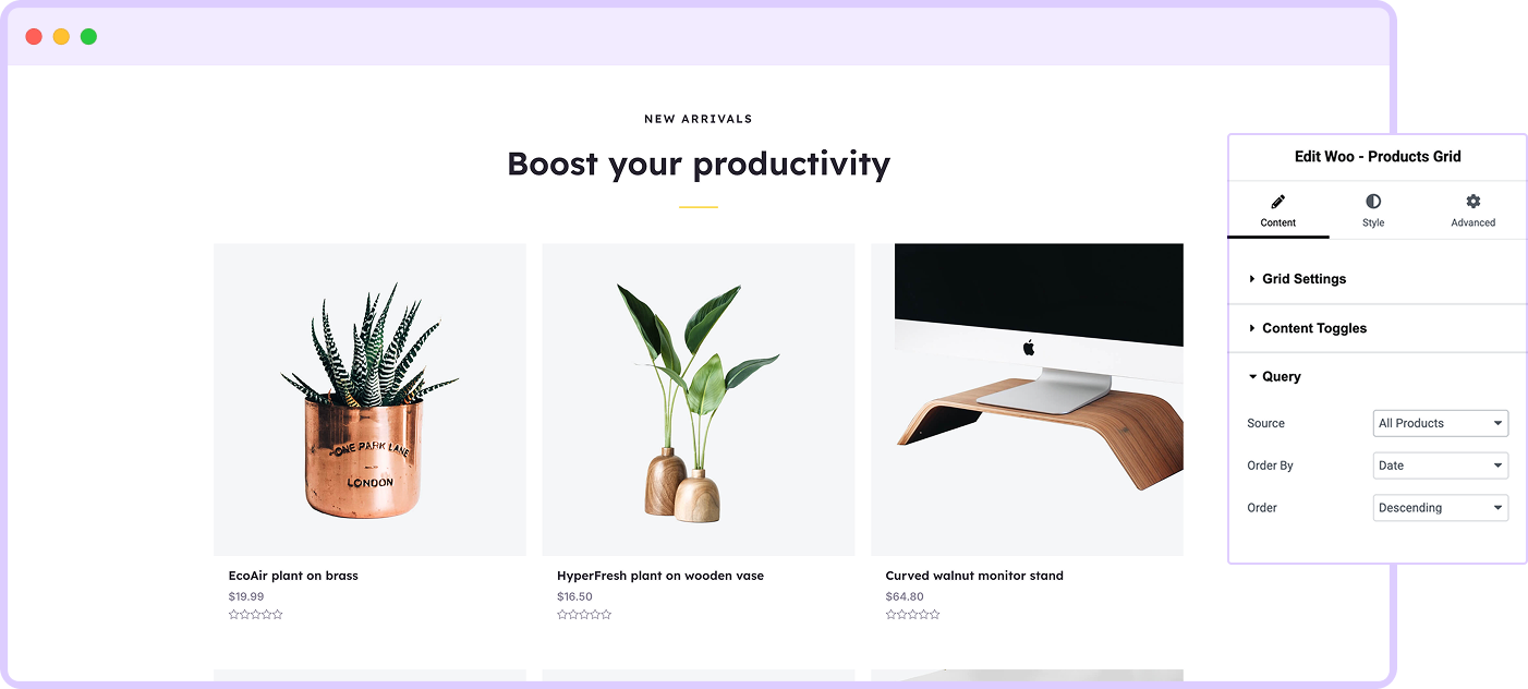 Showcase WooCommerce products in a sleek, customizable grid with images, prices, and ratings optimized for speed, simplicity, and conversions, making shopping easy and engaging
